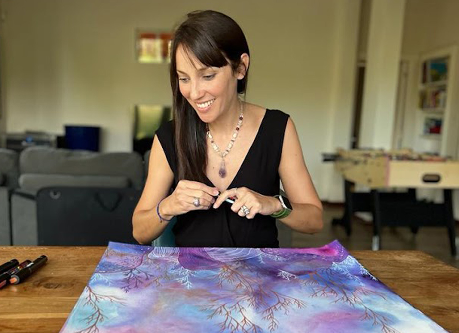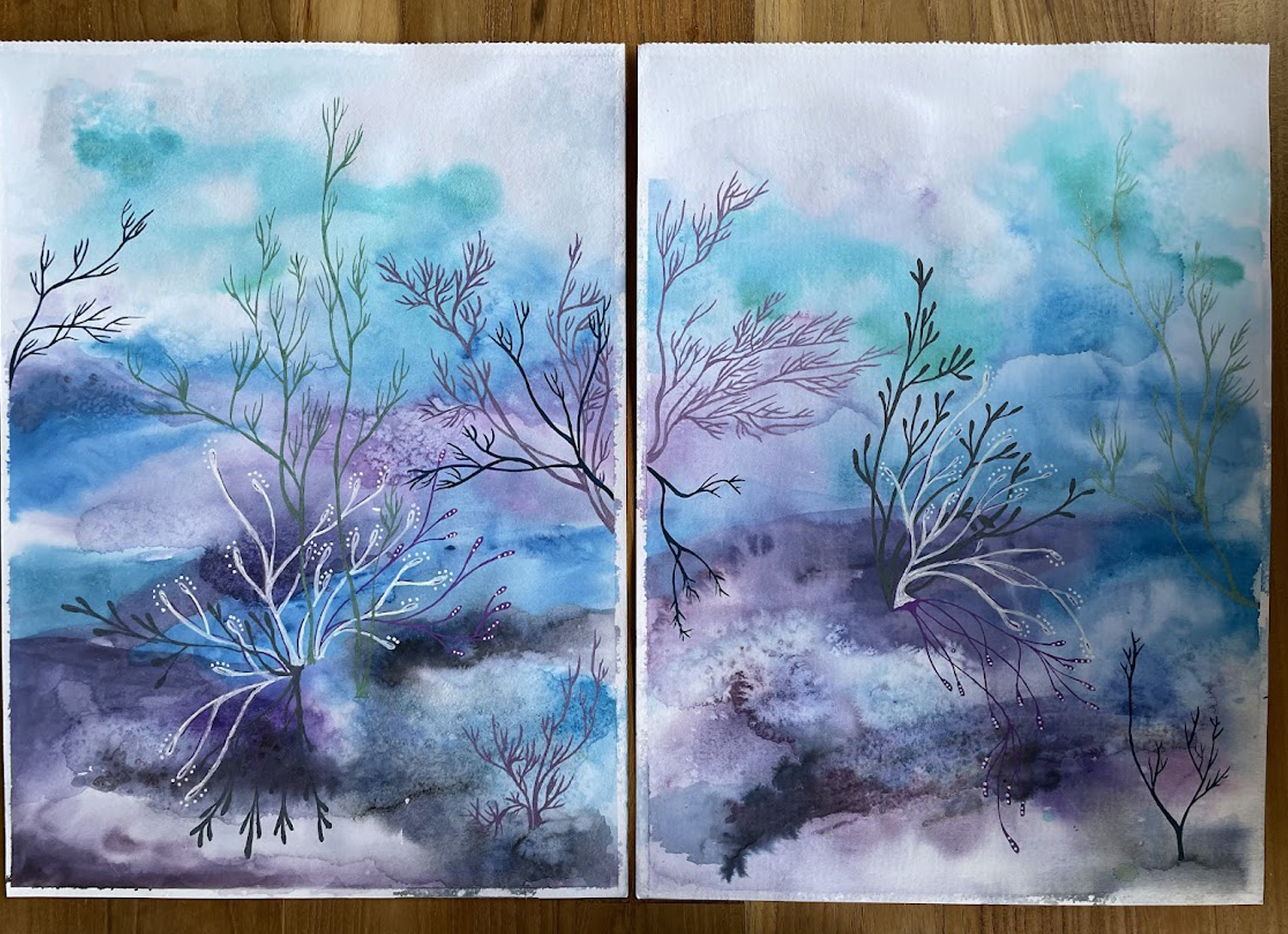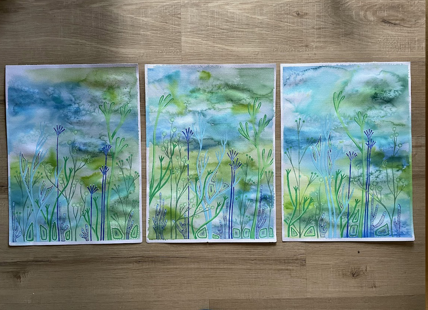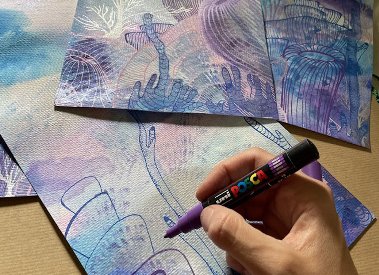 Quand les fonds à l’aquarelle sont secs, j’ajoute mes motifs avec des artists markers et je